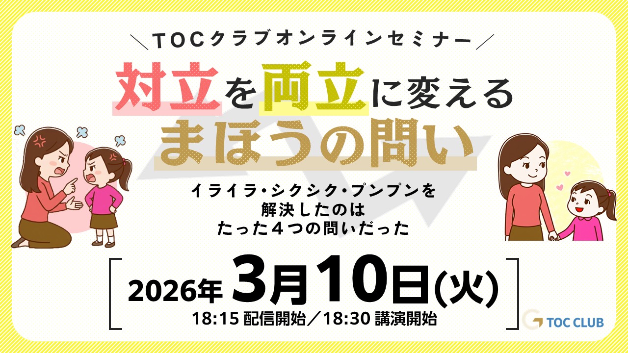 そこで今回のTOCクラブでは、その実践者が実際に体験した子育ての切実な悩みから、ビジネスにおけるジレンマ、そして、